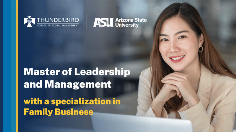 Delivered in partnership with Thunderbird School of Global Management (ASU), this one-year hybrid program is tailored to heirs and managers of family enterprises. It offers global trade insight, leadership development, and innovation management with in-person sessions in Singapore or China.